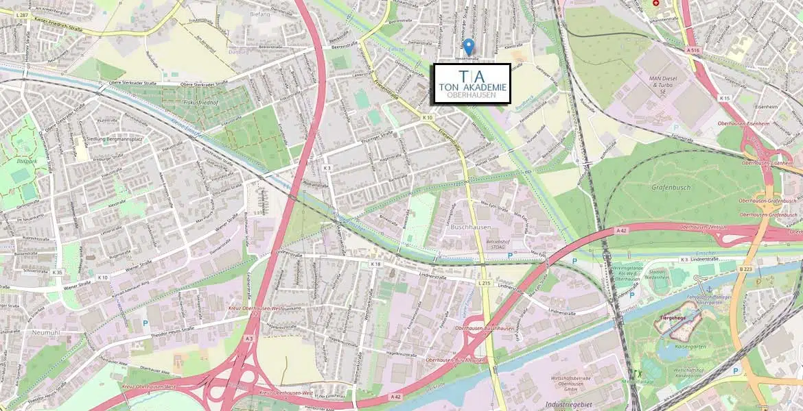 Der Weg aus den umliegenden Städten Bochum, Borken, Bottrop, Dinslaken, Dorsten, Essen, Gelsenkirchen, Gladbeck, Herne, Hünxe, Kamp-Lintfort, Kirchhellen, Marl, Moers, Mülheim, Recklinghausen, Rheinberg, Schermbeck, Voerde oder Wesel für Deinen Gesangsunterricht oder instrumentalen Musikunterricht in der TON Akademie Oberhausen ist nur ein Katzensprung. Wir liegen besonders verkehrsgünstig mit unmittelbarer Anbindung an die Autobahnen A3 (Oberhausen-Holten) und A42 (Oberhausen-Buschhausen), sowie direkt am Autobahn-Kreuz Oberhausen mit der A516. Durch die direkte Nähe zum Stadtkern Oberhausen-Sterkrade besteht eine direkte Zug-Anbindung durch den Bahnhof Oberhausen-Sterkrade. Die dortige STOAG-Trasse bietet zudem eine Direkt-Verbindung zum Hauptbahnhof Oberhausen. Vom Bahnhof Oberhausen-Sterkrade sind es nur wenige Fußminuten bis zur TON Akademie. Auch die Bus-Haltestelle „Hessenstr.“ mit direkter Verbindung zu beiden Bahnhöfen liegt nur etwa 20m vor unserer Haustüre.